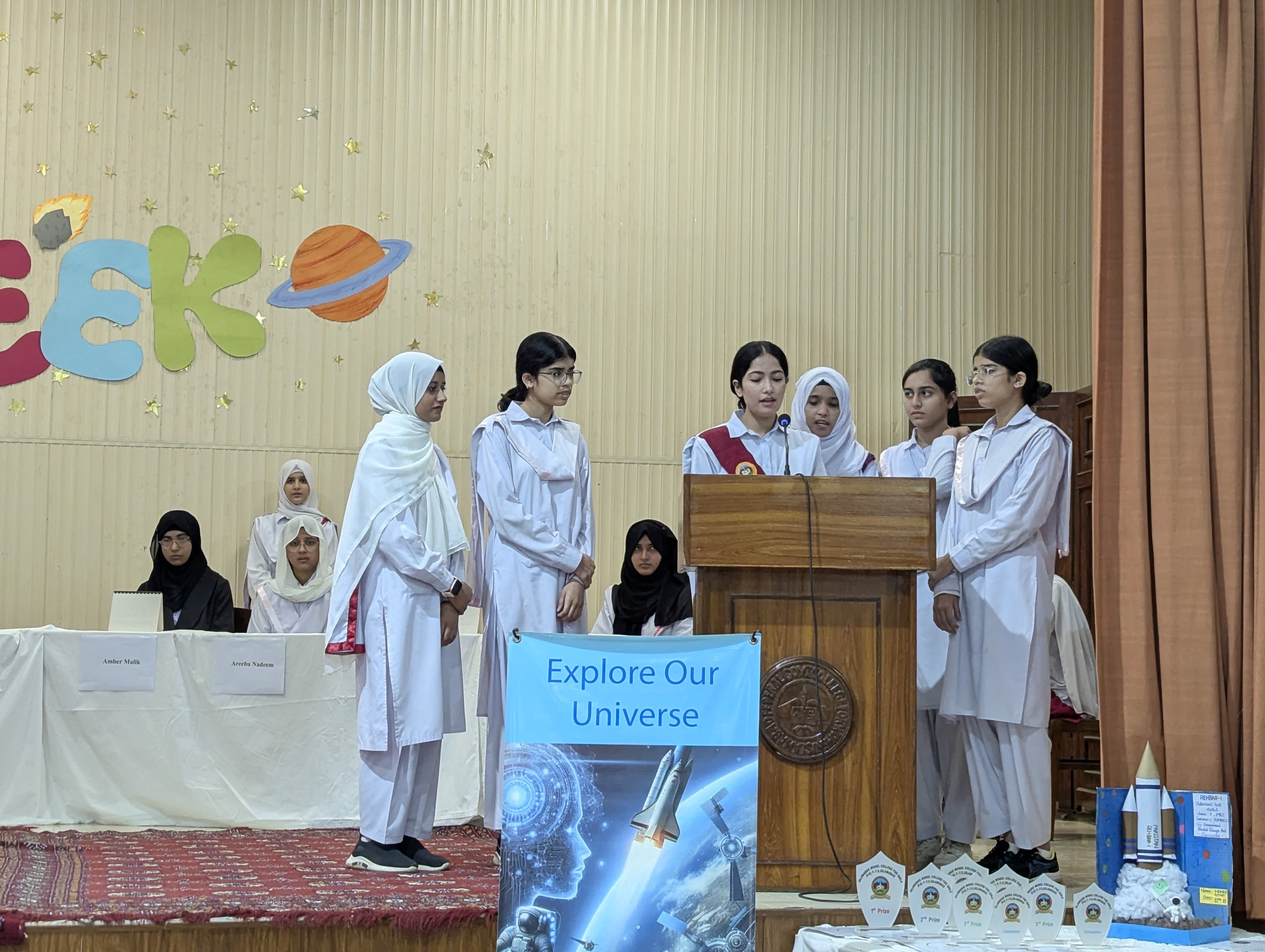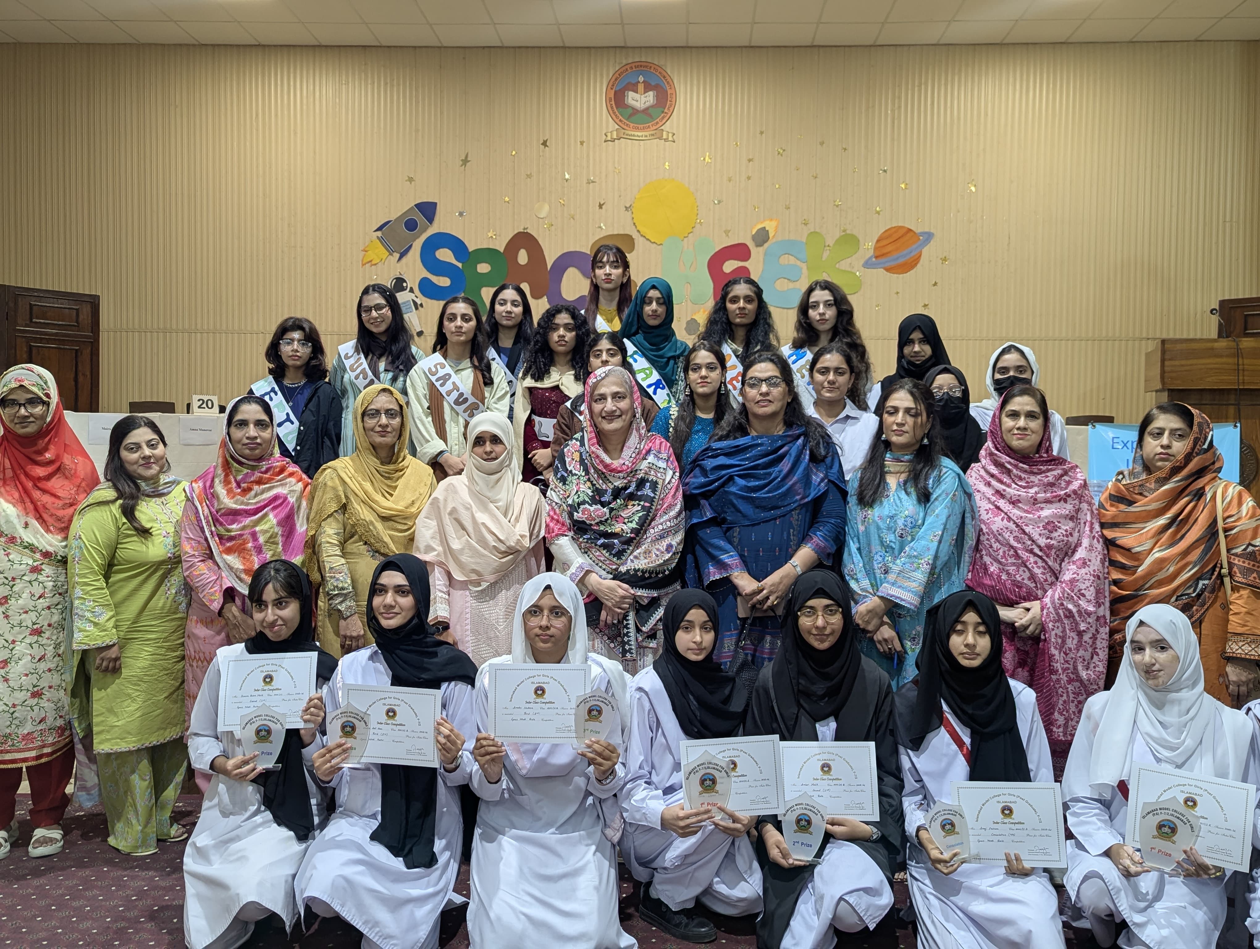 The Department of Physics organised various activities to celebrate World Space Week at IMCG (PG) F-7/2 Islamabad. The students took part in a Poster Making Competition and Quiz Competition with great enthusiasm. The Chief Guest for the Quiz Competition, held in the college auditorium, was the Principal of the college, Dr. Fauzia Tanveer Sheikh. The judges for the quiz competition were Ms. Samina Tanveer (Associate Professor, Dept. of Mathematics) and Dr. Salma Shehnaz (Associate Professor, Dept. of Chemistry). A total of 7 teams took part in the battle of the brains to display their knowledge about our universe, earth and the satellite system. In the final round, the participants competed independently for the top prizes. The results of the quiz competition are as under: